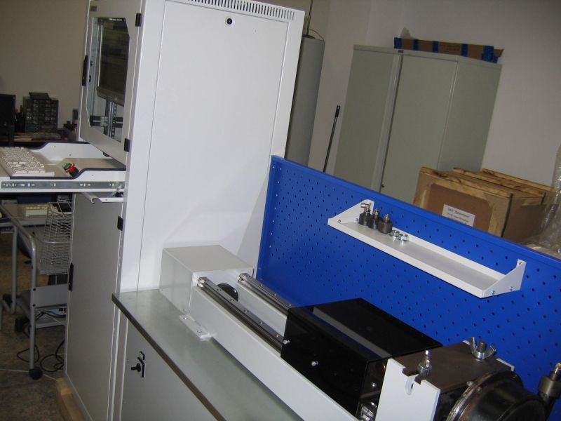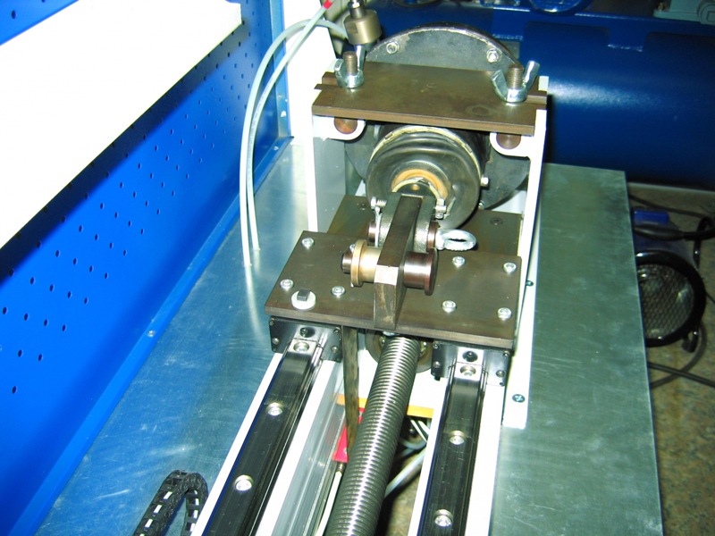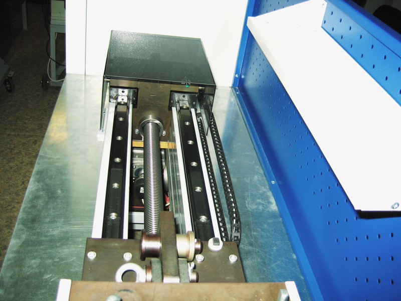 Стенд представляет собой верстак, на котором смонтирован электромеханический блок регулирования перемещения упора. На блоке крепится испытываемый тормозной цилиндр, шток которого крепится на каретке, каретка соединена с датчиком линейных перемещений. Система управления и персональный компьютер, управляющий всеми процессами, происходящими на стенде , смонтированы в 19” стойке фирмы Conteg.